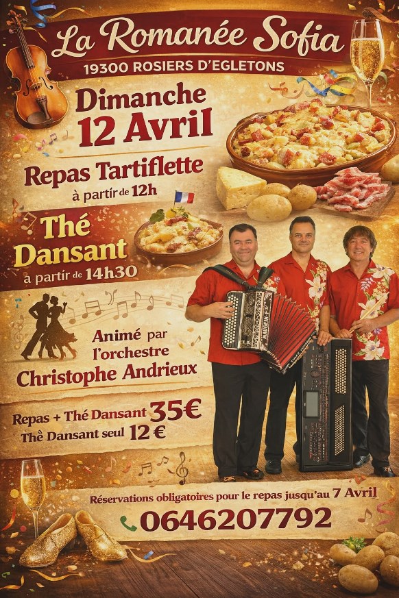 Sofia , 12h repas tartiflette , 14h30 thé dansant , animé