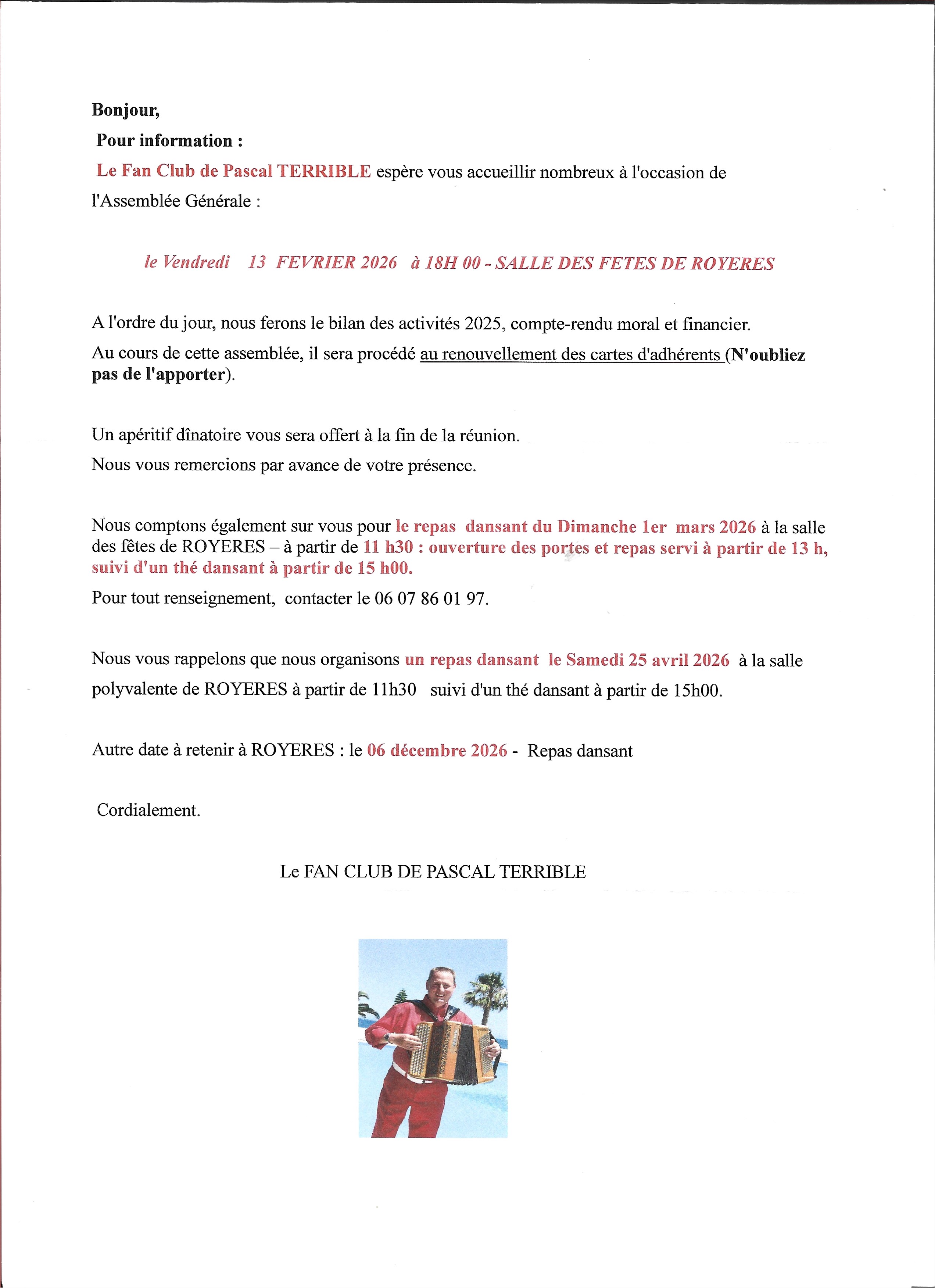 Royères (87) 18h salle des fêtes AG du Fan Club de Pascal TERRIBLE Affiche